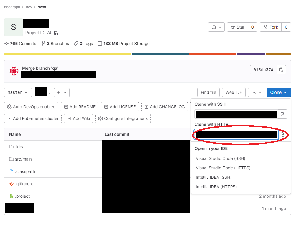 3. 본인이 소스를 받고자 하는 gitlab url 접속 후 로그인 해준다. 그 후 프로젝트 클릭 => 우측 Clone 버튼 클릭 => Clone With HTTP URL 복사 이 순서로 차례대로 해준다.