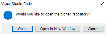 8. 현재창으로 띄울거냐 새창으로 띄울까냐 경고창이다. 입맛따라 선택하자~ 그러면 VSCode에 Gitlab 소스코드를 받을 수 있음을 확인