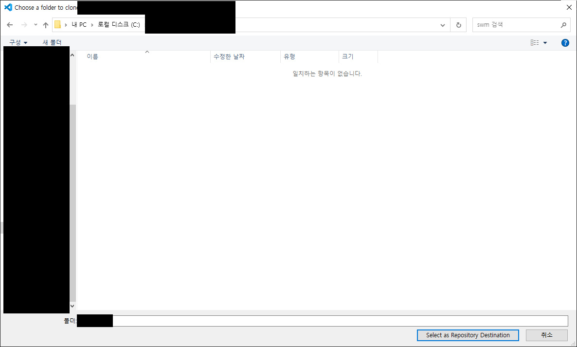4. VS Code로 돌아와서 repository url 복붙 후 Enter! 저장할 소스 경로 선택 후 "Select as Repository Destination" 클릭해준다.