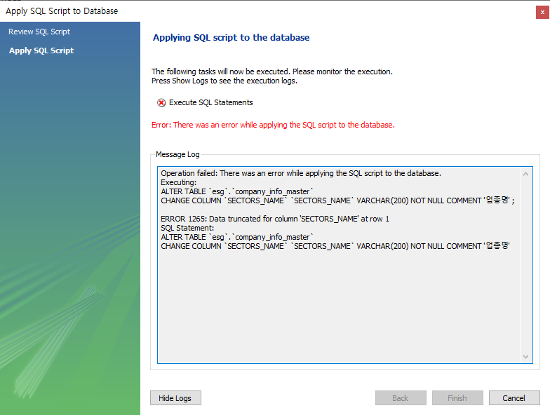 컬럼 정보를 변경하려고 적용버튼 클릭했더니 요런 에러가 발생했다.