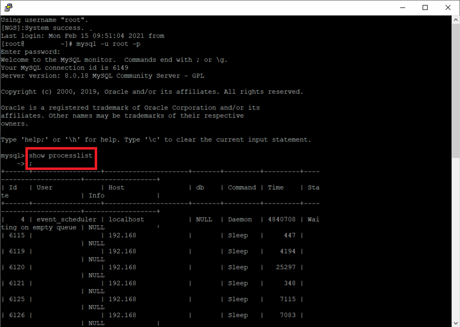 이러한 현상이 지속되는 경우 show processlist를 통해 확인 후, kill 명령어를 통해 실행을 중단시킬 수 있다