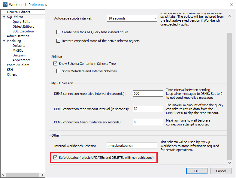 Edit 메뉴 => Preferences... => SQL Editor 클릭 => Safe Updates ( ... ) 체크박스 활성화